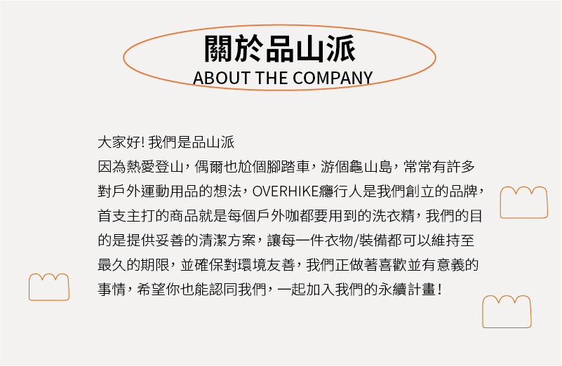 大家好,我們是OVERHIKE癮行人,我們將市面上的運動衣物分成「機能衣物」與「美麗諾羊毛衣」兩大類,分別對於衣物纖維的特性調製出最適合的洗衣精,搭配獨家的甘蔗酵素及Ecocert有機認證配方,讓每一次的洗衣都是愉快的體驗,獨創使用鋁瓶包裝,鼓勵戶外咖們加入我們的「0塑永續計畫」,達到三大訴求: